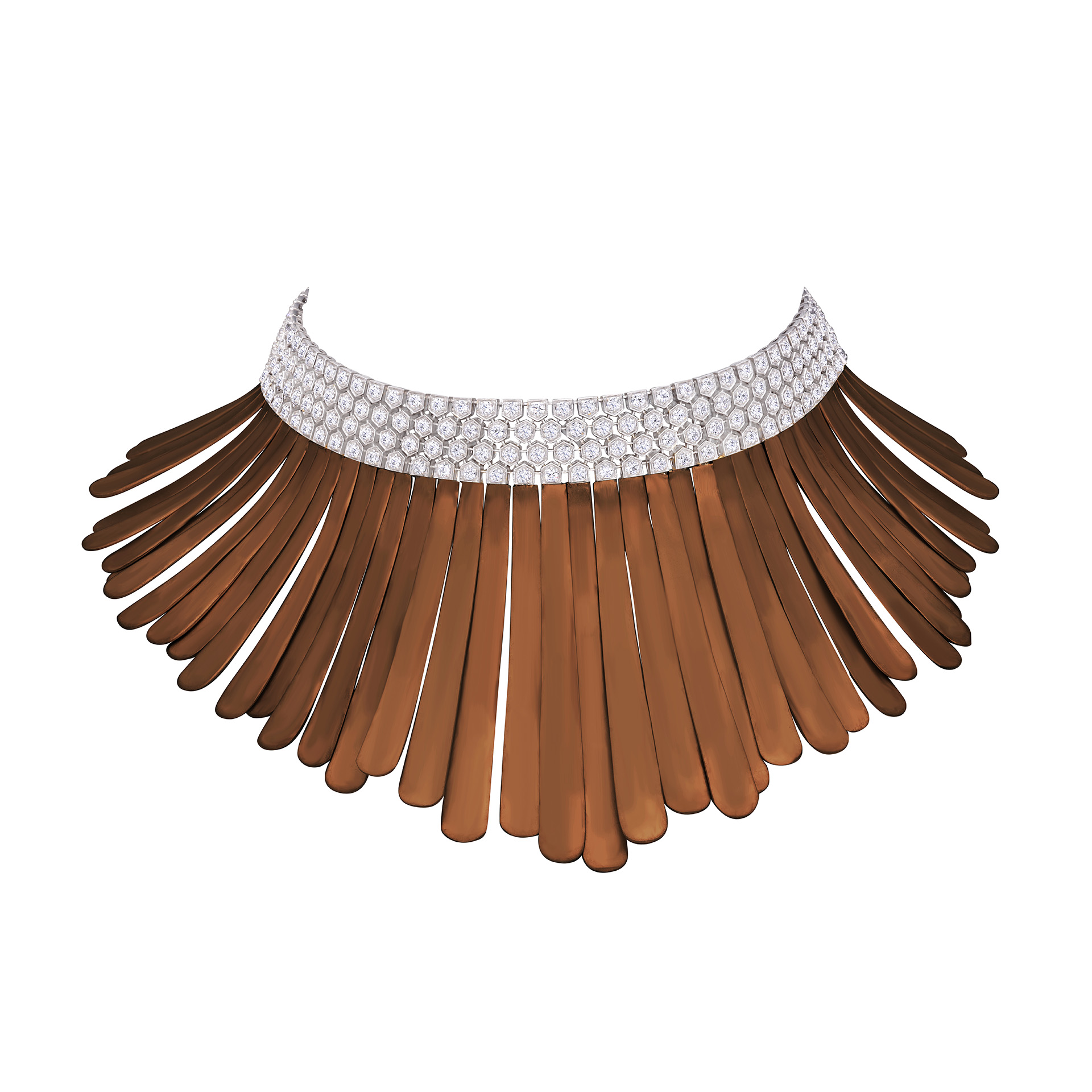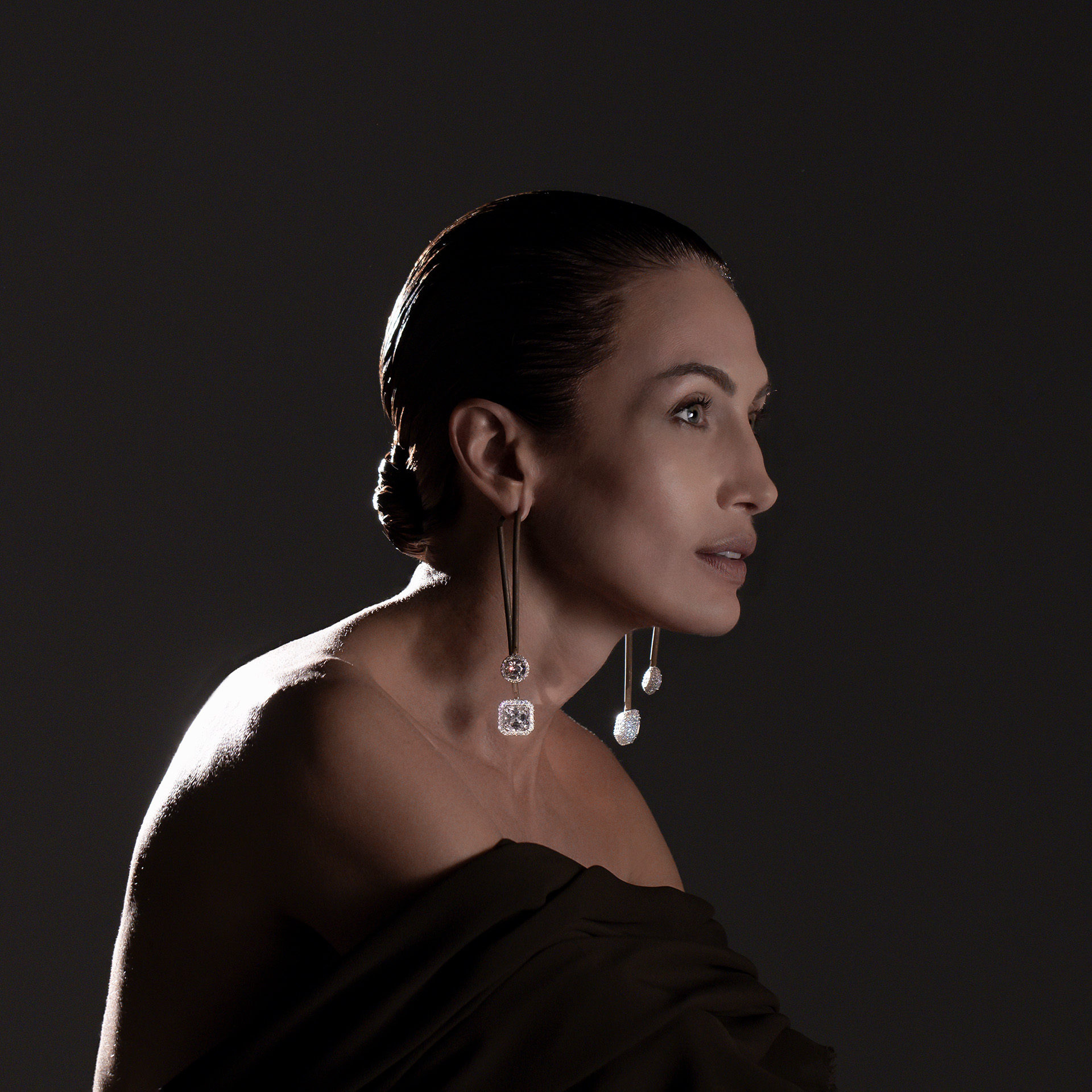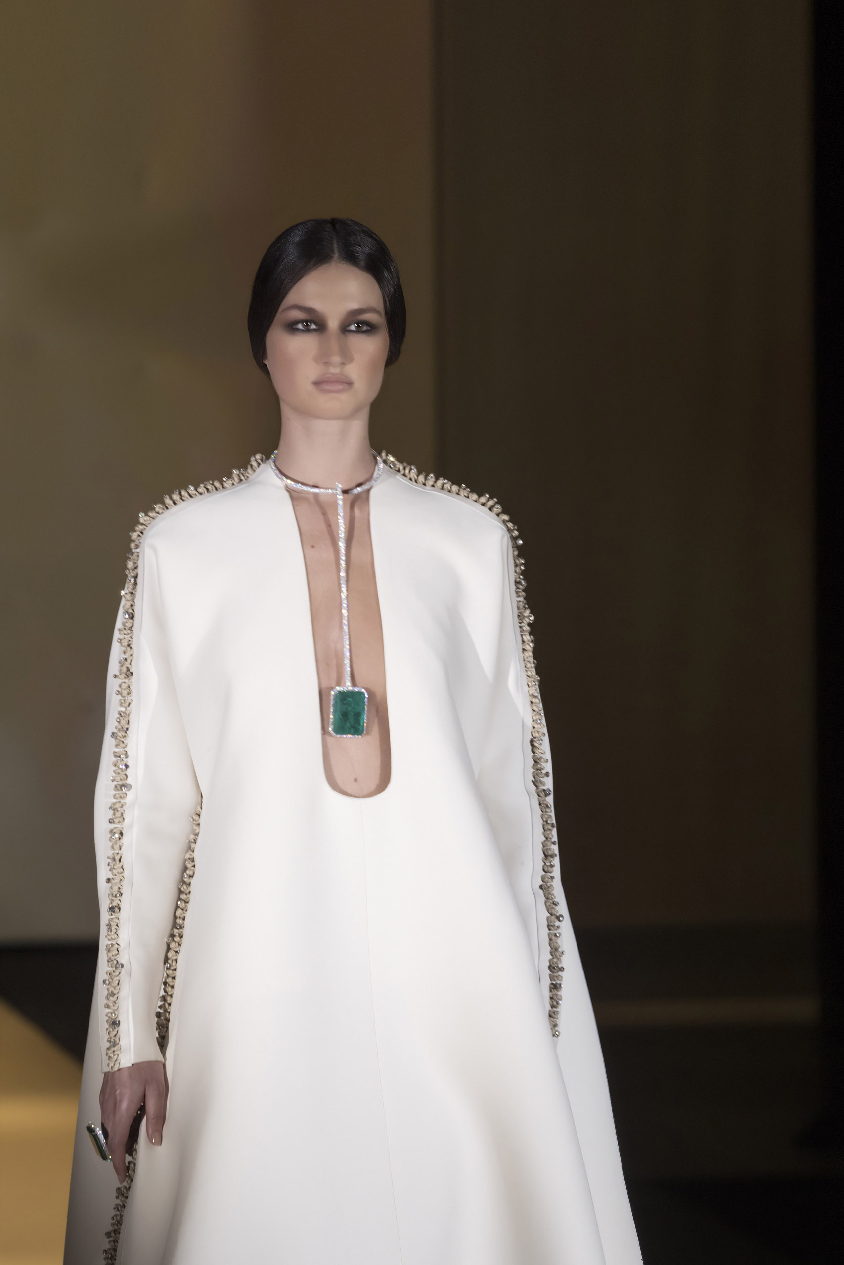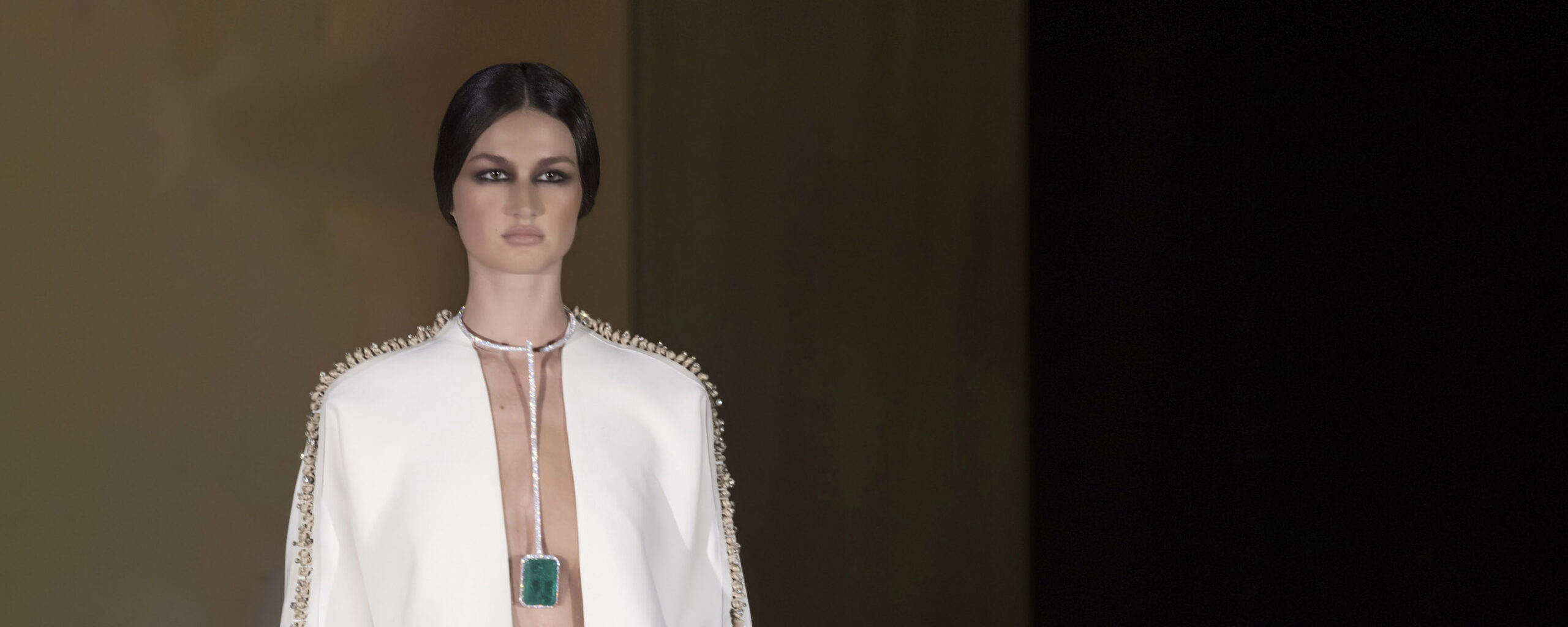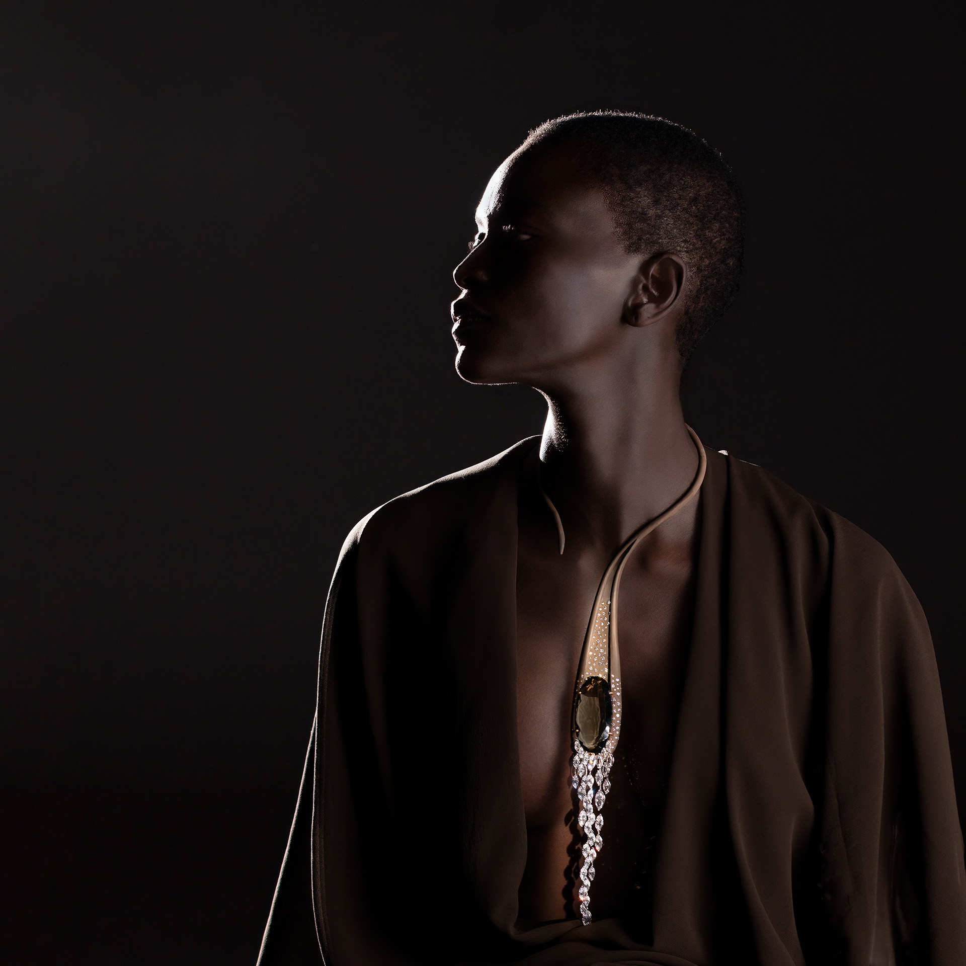An unlimited dream of jewellery sculptures with infinite dimensions. Almost real stones for the illusion of limitless design. The craftsmanship of High Jewellery creates pieces of Haute Couture. The act of drawing no longer worries about constraints, creating a play between theatricality and contemporaneity. The style is confident, sophisticated, and timeless. Exceptional sets of jewellery.