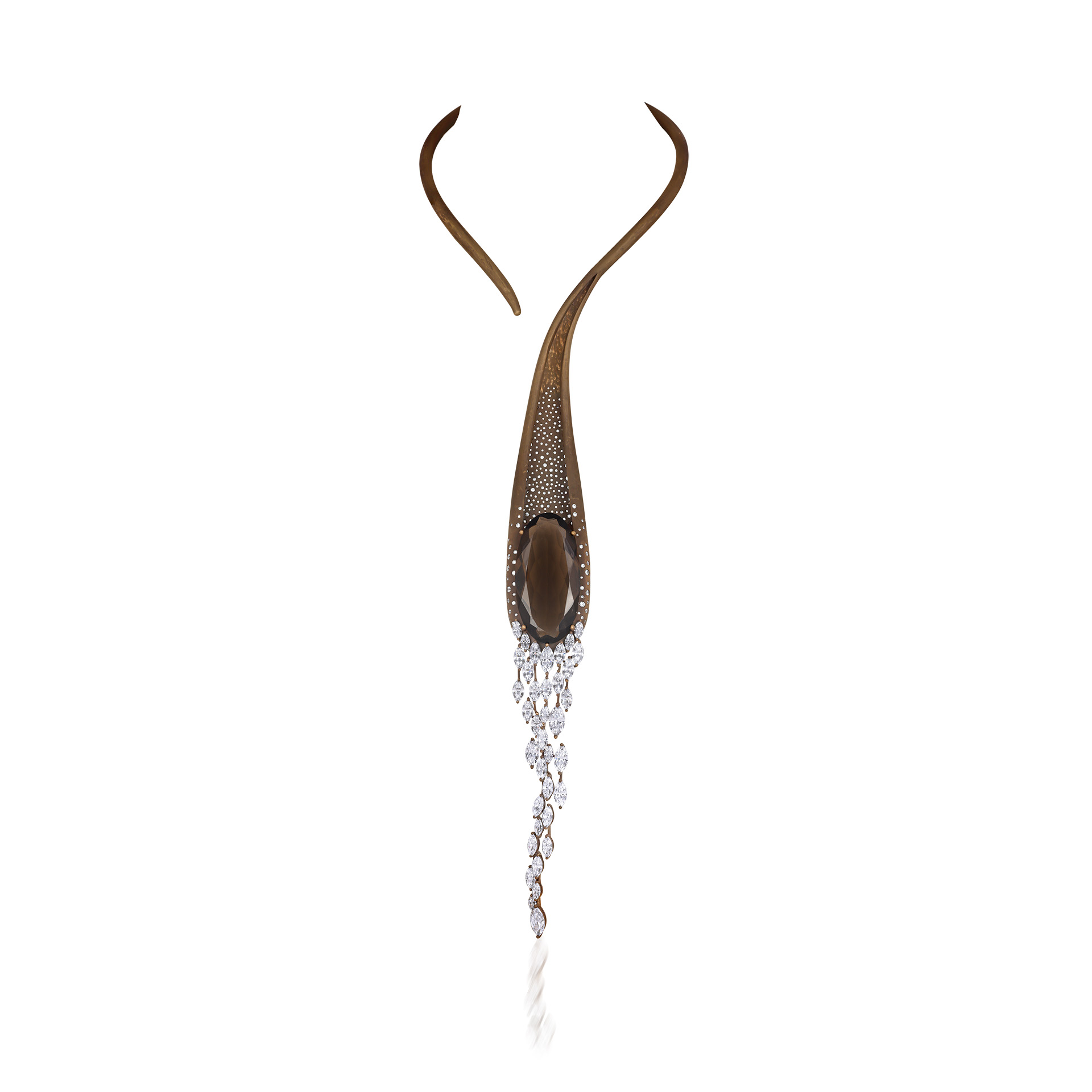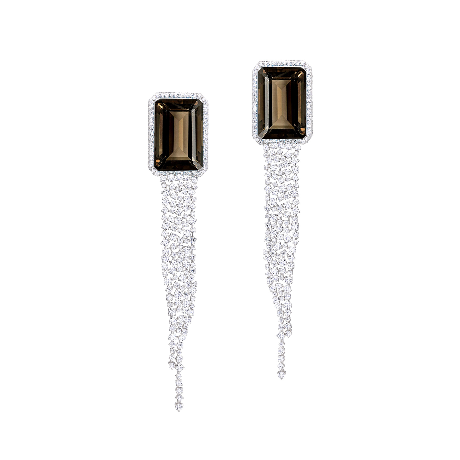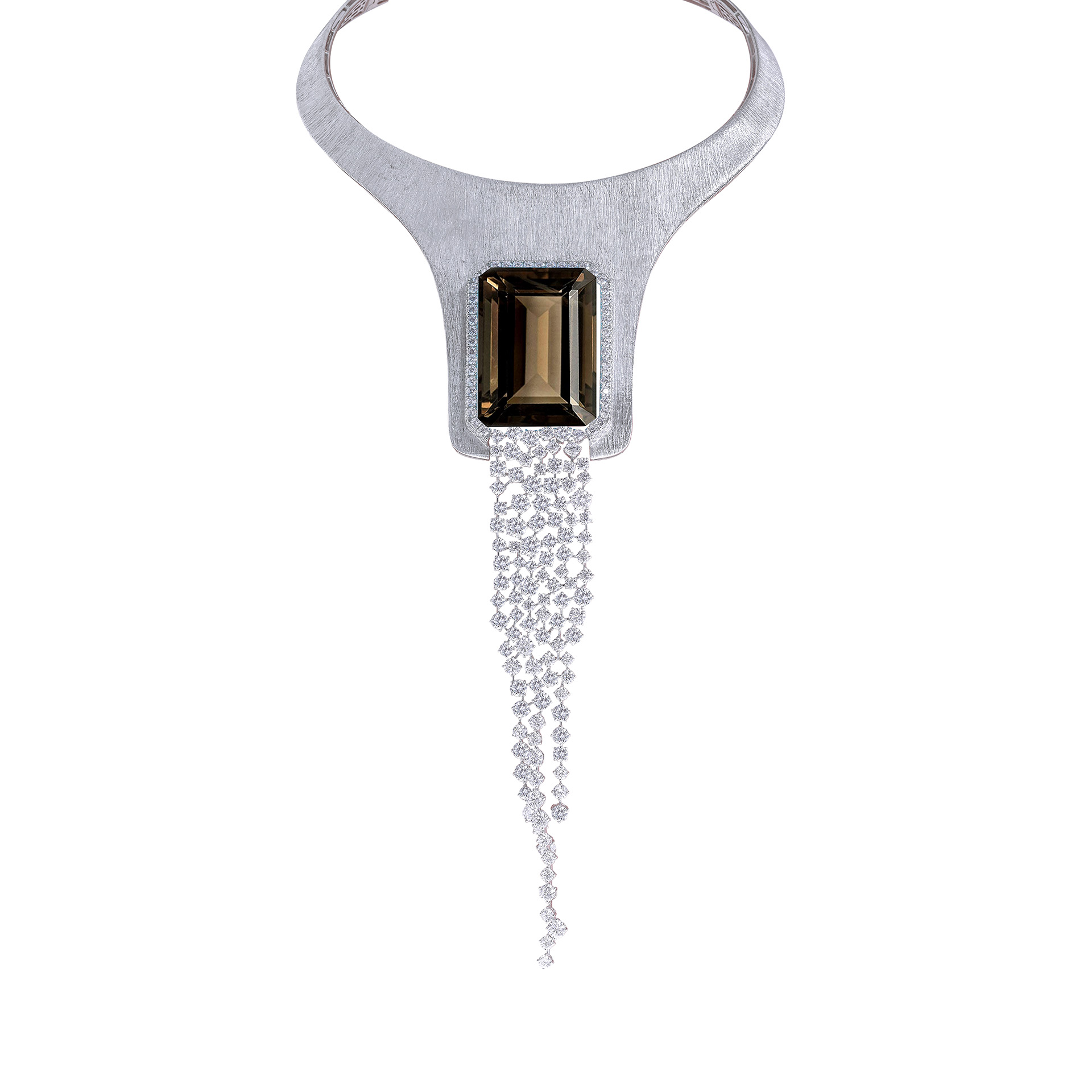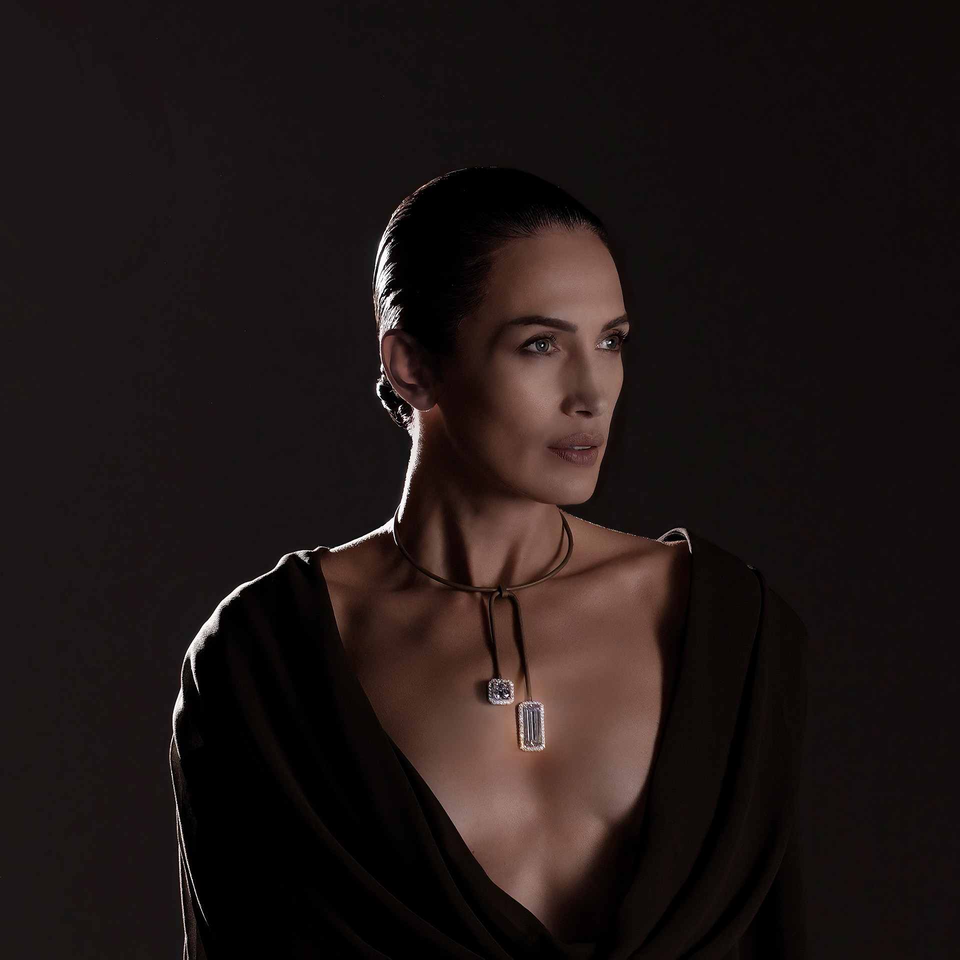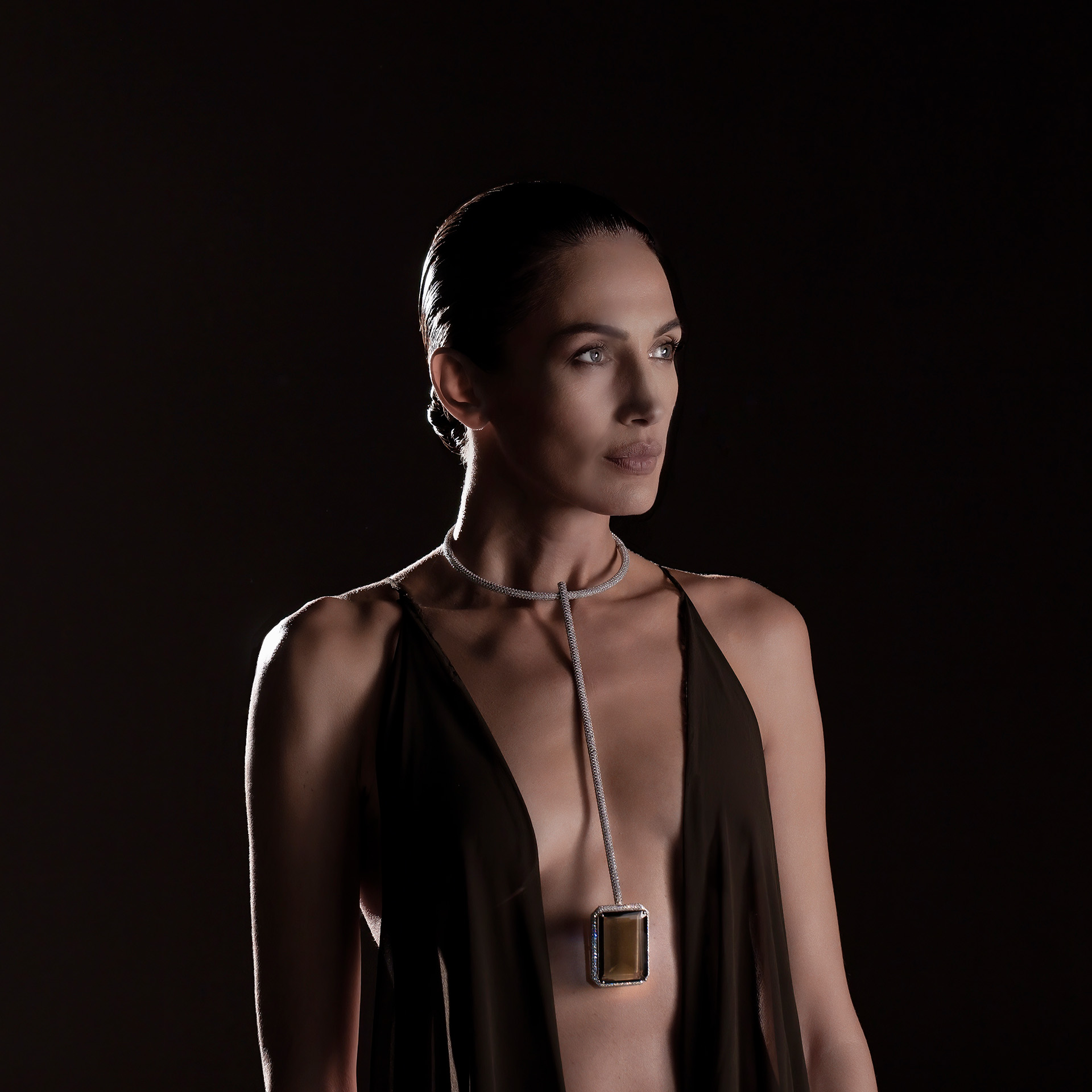 An unlimited dream of jewellery sculptures with infinite dimensions. Almost real stones for the illusion of limitless design. The craftsmanship of High Jewellery creates pieces of Haute Couture. The act of drawing no longer worries about constraints, creating a play between theatricality and contemporaneity. The style is confident, sophisticated, and timeless. Exceptional sets of jewellery.